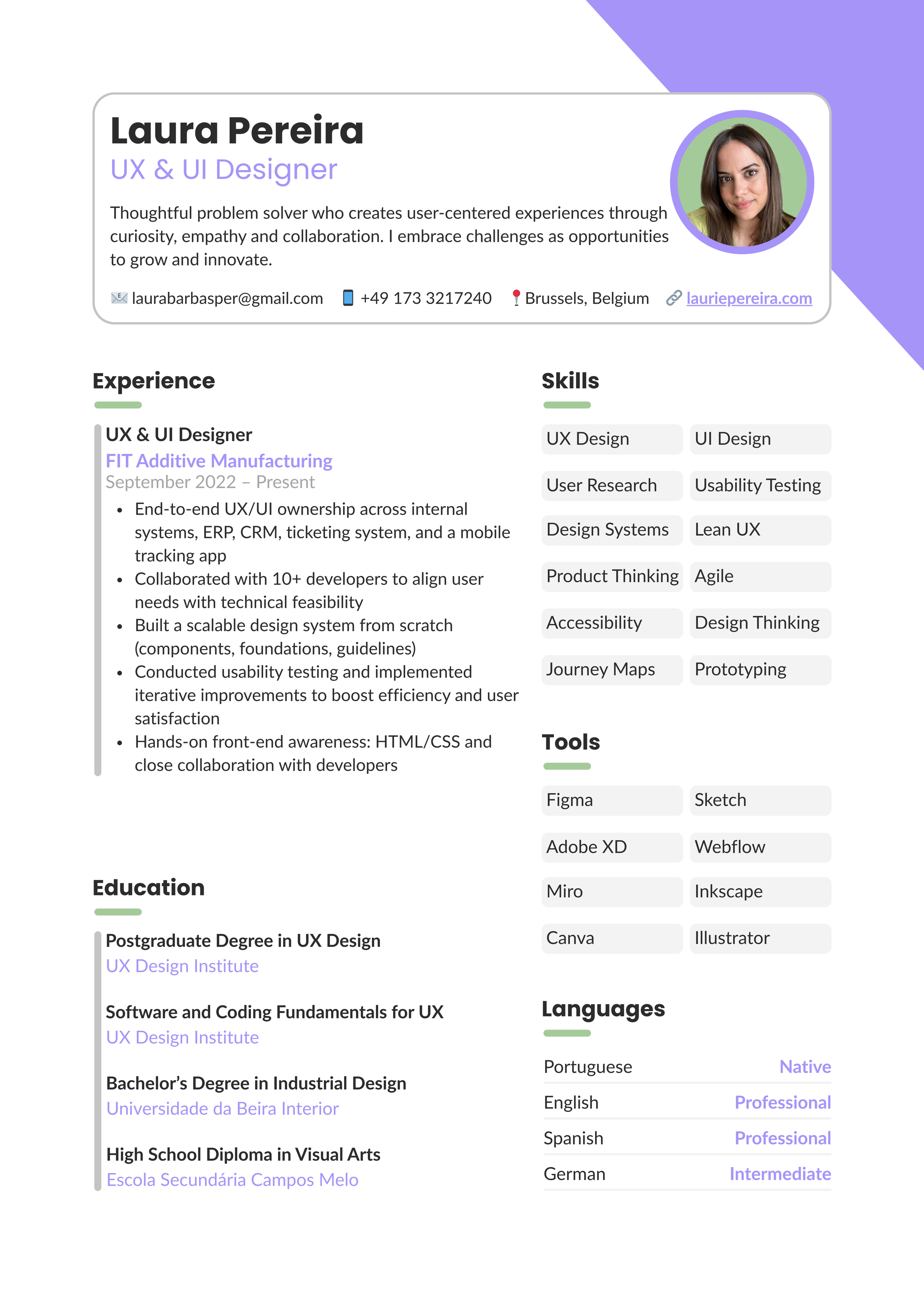 I have a background in Industrial Design and a post-graduate degree in UX Design. Over the last few years, I've been working at an engineering company in Germany as the sole designer in the software team. I do a bit of everything: from research and flow creation to wireframing and prototyping internal tools and digital interfaces.